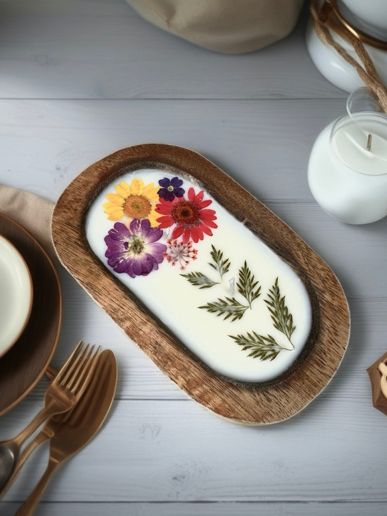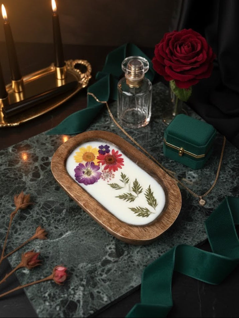 Bring a touch of nature-inspired serenity into your home with the Lush & Lumen Floral Essence Candle, a hand-poured soy wax candle beautifully adorned with pressed wildflowers and delicate ferns. Set in a rustic wooden dough bowl, this artisanal piece creates a calming, earthy ambience, ideal for gifting or elevating your own mindful moments.
