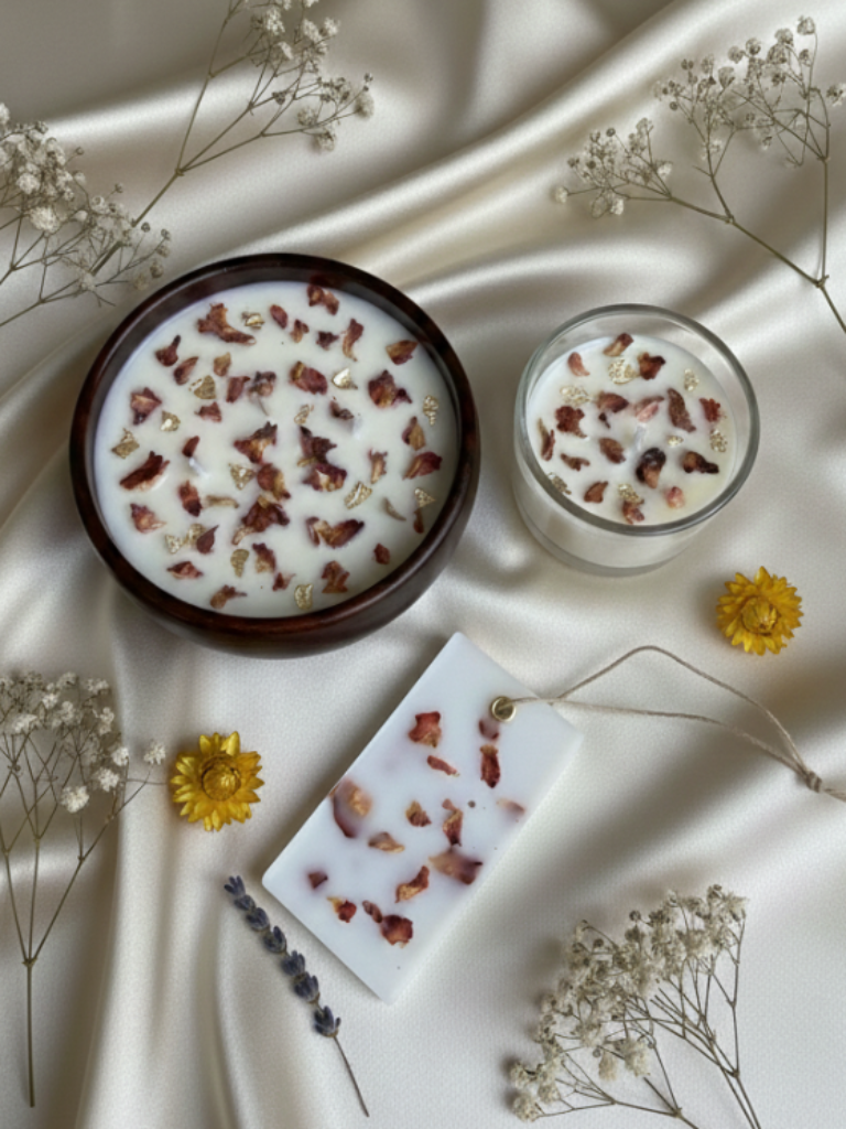 Bring soft elegance and romantic warmth into your home with the Lush & Lumen Rose Ember Combo. Thoughtfully handcrafted using natural soy wax, this refined set includes a statement bowl candle, a mini glass candle, and a scented hanging wax tablet, each delicately adorned with dried rose petals and shimmering gold leaf accents.