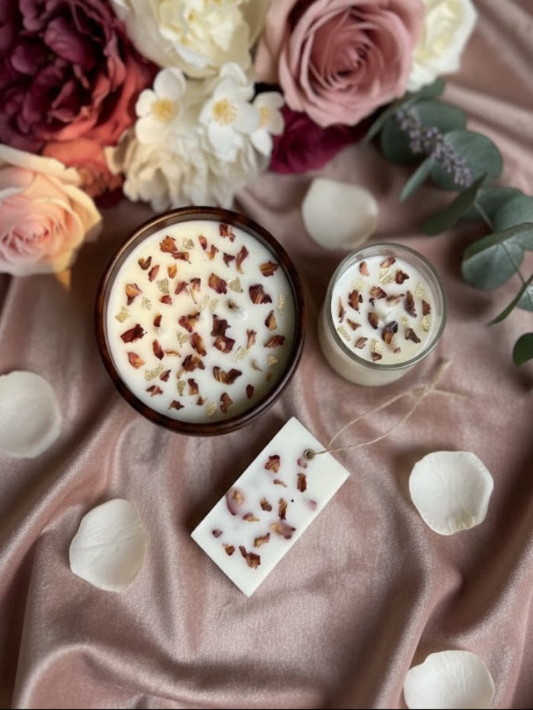 - Decor Elements: Dried rose petals & gold leaf flakes