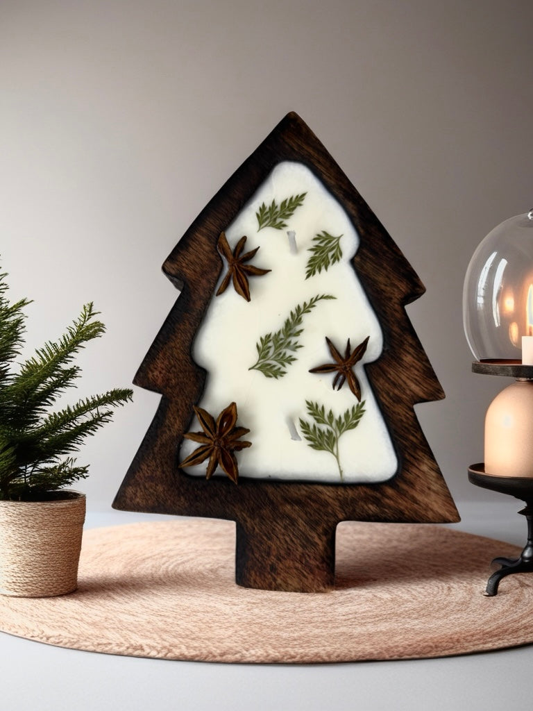 Illuminate your festive season with the enchanting glow of the Lush & Lumen Winter Fern Candle, a hand-poured blend of natural soy wax set into a beautifully carved wooden Christmas tree base. Decorated with dried ferns and star anise, this artisanal candle brings the magic of winter forests into your home, perfect as a decorative centrepiece or a thoughtful seasonal gift.